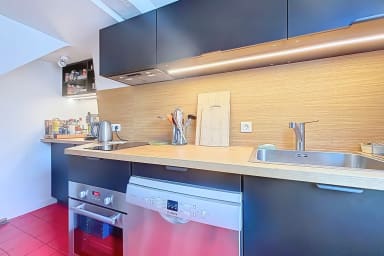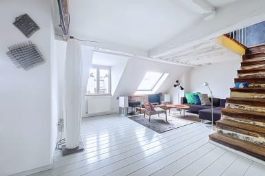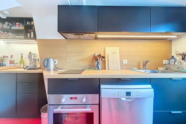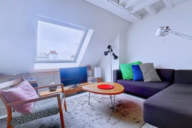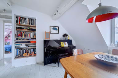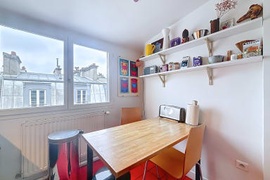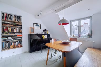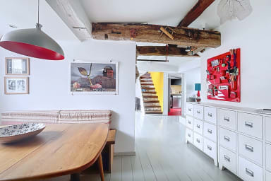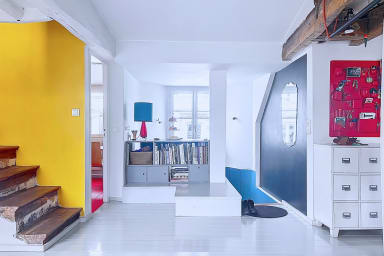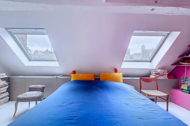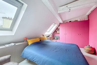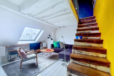 Bright and colorful apartment on the 5th floor with elevator, perfect for a couple. It offers two bedrooms, one upstairs for a child, accessible by stairs (without railing), a separate living room and a fully equipped kitchen. Located in the immediate vicinity of the Gare de l'Est, metros, shops, cafes and the Canal Saint-Martin.