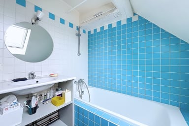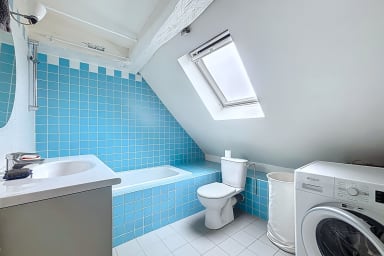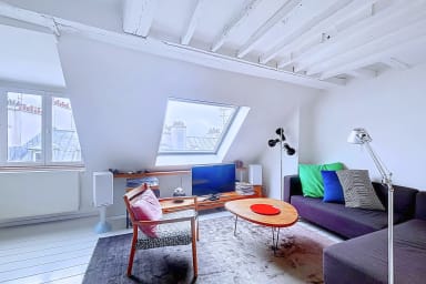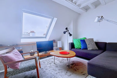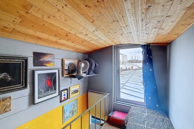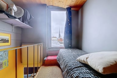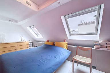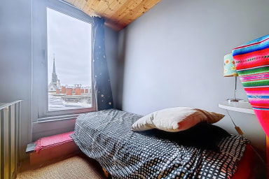 The first bedroom has a king size bed. The second bedroom, arranged upstairs with a view of Paris, includes a small single bed (78x190), ideal for a child, and brings an original configuration to the housing.